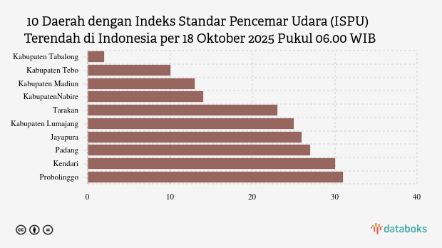 Kualitas udara Kabupaten Tabalong pagi ini paling bersih di Indonesia. Berdasarkan indeks kualitas udara versi Kementerian Lingkungan Hidup dan Kehutanan (KLHK), Kabupaten Tabalong memiliki skor 2 pada Sabtu (18/10/2025) pukul 06.00 WIB.