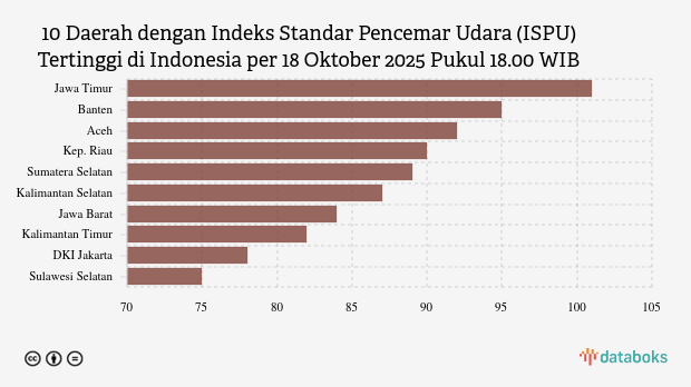 Kualitas Udara di Jawa Timur malam ini terburuk di Indonesia. Berdasarkan halaman Indeks Standar Pencemar Udara (ISPU) Kementerian Lingkungan Hidup dan Kehutanan (KLHK) pada Sabtu (18/10/2025) pukul 18.00 WIB terungkap bahwa indeks kualitas udara di Jawa Timur sebesar 101.