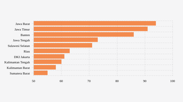 Di bawah Jawa Barat, ada Jawa Timur yang menempati posisi kedua terburuk di Indonesia dengan indeks kualitas udara 91. Kemudian, di posisi ketiga ada Banten dengan indeks kualitas udara 86.