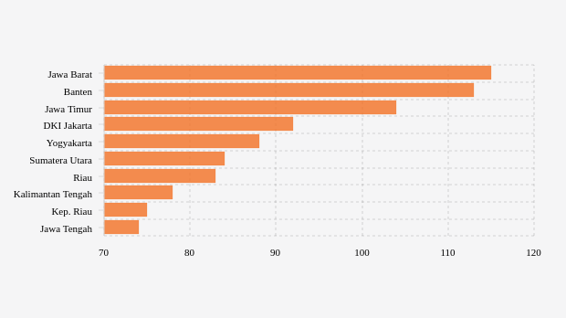 Di bawah Jawa Barat, ada Banten yang menempati posisi kedua terburuk di Indonesia dengan indeks kualitas udara 113. Kemudian, di posisi ketiga ada Jawa Timur dengan indeks kualitas udara 104.