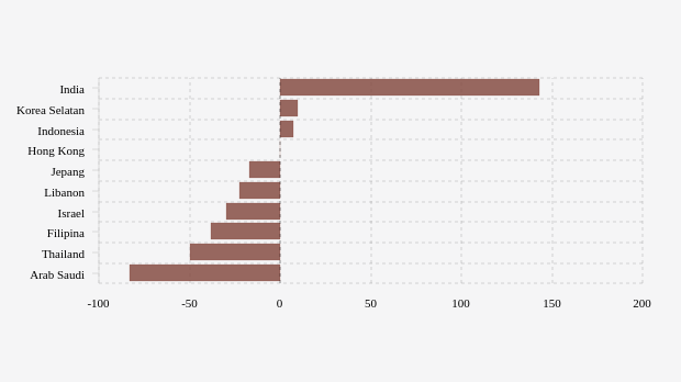 India mencatatkan penambahan kematian tertinggi di Asia dengan pertumbuhan mingguan mencapai 142,86 persen. Di negara ini, Worldmeter mencatat jumlah kematian sebanyak 68 jiwa naik 70 persen dibandingkan hari sebelumnya.
