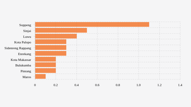 Soppeng adalah kabupaten di urutan pertama dengan positivity rate aglomerasi tujuh hari terakhir tertinggi sebesar 1,05 persen. Kondisi positivity rate aglomerasi tujuh hari terakhir di kabupaten ini terlihat belum membaik karena terjadi peningkatan dibandingkan pekan sebelumnya yang tercatat 0,55 persen.