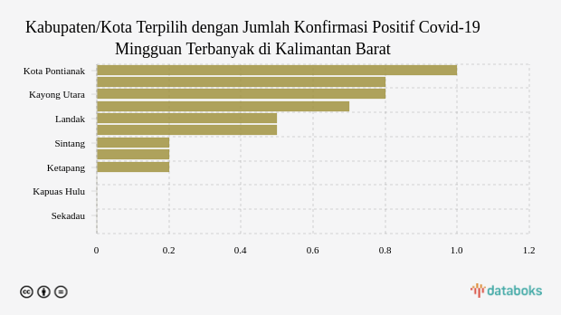 Kota pontianak berada di urutan pertama dengan jumlah konfirmasi positif covid-19 mingguan terbanyak sebesar 1,04 jiwa per 100 ribu penduduk/minggu. Kondisi jumlah konfirmasi positif covid-19 mingguan di kota ini memperlihatkan ada kemajuan dengan adanya penurunan dibandingkan pekan sebelumnya yang tercatat 1,33 jiwa per 100 ribu penduduk/minggu.