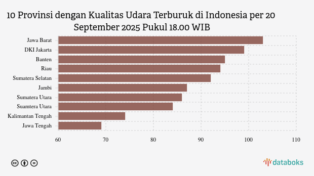 Berikut daftar 10 provinsi dengan indeks kualitas udara terburuk di Indonesia pada Sabtu, 20 September 2025 pukul 18.00 WIB.
