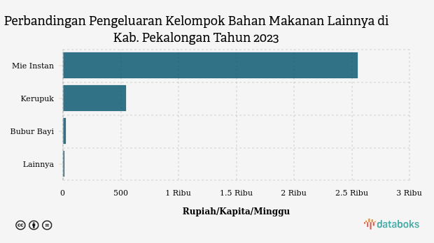 Empat terbesar pengeluaran penduduk untuk kelompok bahan makanan lainnya di kabupaten Pekalongan dari urutan tertinggi dibelanjakan untuk mie instan Rp2.548,89 per kapita per minggu, kerupuk Rp546,1 per kapita per minggu, bubur bayi Rp26,32 per kapita per minggu dan terrendah dibelanjakan untuk lainnya Rp9,81 per kapita per minggu