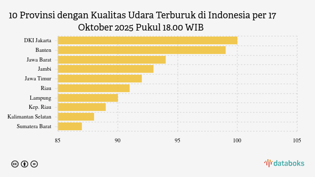 Berikut daftar 10 provinsi dengan indeks kualitas udara terburuk di Indonesia pada Jumat, 17 Oktober 2025 pukul 18.00 WIB.