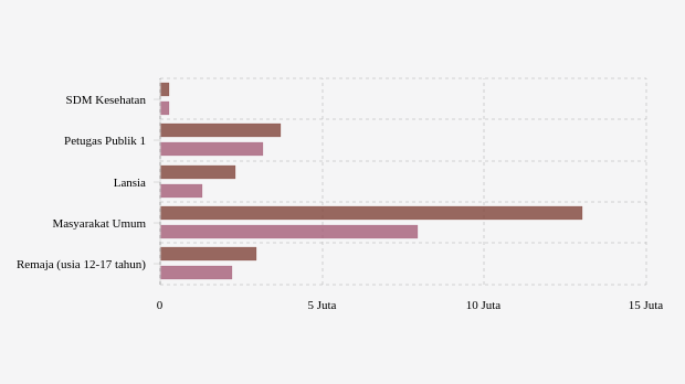 Vaksinasi ke petugas publik dengan target 2,07 juta jiwa. Vaksinasi dosis 1 dilaporkan telah mencapai 3,71 juta jiwa (178,97 persen target) dan dosis 2 dengan capaian 152,67 persen atau berhasil tersalurkan sebanyak 3,16 juta jiwa.