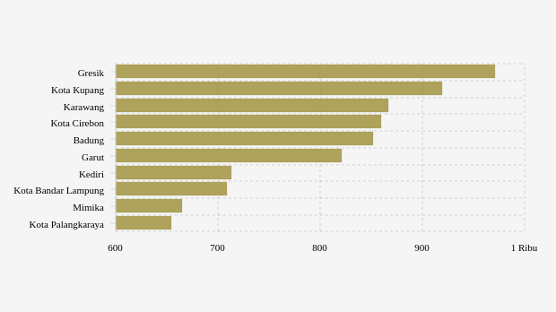 Urutan lima teratas dimulai dari yang terbesar adalah Gresik, kota Kupang, Karawang, kota Cirebon dan Badung dengan masing-masing angka spesimen per minggu 971 spesimen per minggu, 919 spesimen per minggu, 867 spesimen per minggu, 860 spesimen per minggu dan 852 spesimen per minggu.