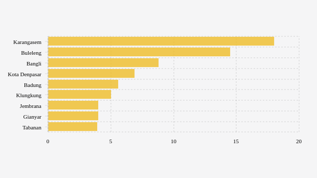 Karangasem adalah kabupaten di urutan pertama dengan BOR tertinggi sebesar 17,98 persen. Kondisi BOR di kabupaten ini memperlihatkan ada kemajuan dengan adanya penurunan dibandingkan pekan sebelumnya yang tercatat 27,59 persen.