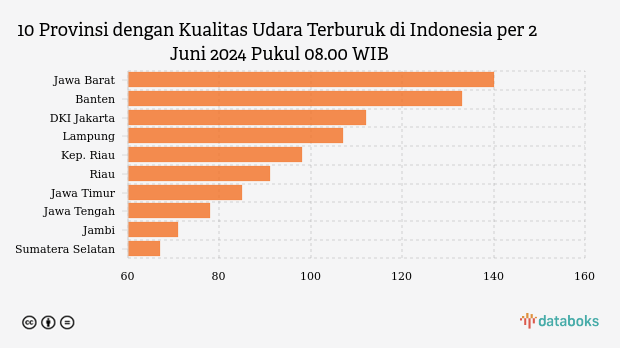 Berikut daftar 10 provinsi dengan indeks kualitas udara terburuk di Indonesia pada Minggu, 2 Juni 2024 pukul 08.00 WIB.
