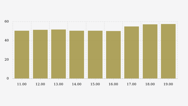 Konsentrasi PM2.5 udara Jakarta terendah berada di level 50,1 µg/m³ pada pukul 16.00 WIB, sedangkan konsentrasi PM2.5 tertinggi pada pukul 19.00 WIB dengan nilai 57,3 µg/m³.