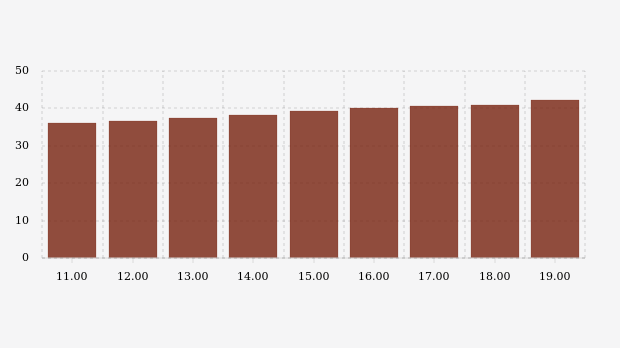 Konsentrasi PM2.5 udara Jakarta terendah berada di level 36,2 µg/m³ pada pukul 11.00 WIB, sedangkan konsentrasi PM2.5 tertinggi pada pukul 19.00 WIB dengan nilai 42,2 µg/m³.