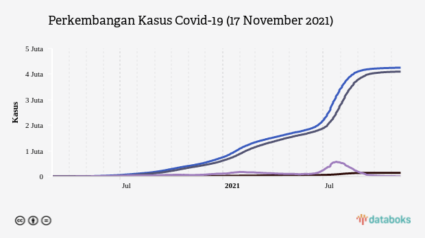 Pemerintah melaporkan kasus Covid-19 di Indonesia bertambah 522 kasus pada Rabu (17/11). Dengan begitu, total kasusnya menjadi 4.251.945 kasus. Sebanyak 4.099.857 orang di antaranya telah dinyatakan sembuh (96.42%) dan 143.698 orang meninggal dunia (3.38%), sementara sisanya masih menjalani perawatan.