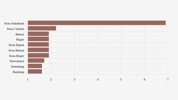 Kota sukabumi berada di urutan pertama dengan penggunaan rawat inap aglomerasi mingguan terbanyak sebesar 6,93 pasien per 100 ribu penduduk/minggu. Kondisi penggunaan rawat inap aglomerasi mingguan di kota ini terlihat belum membaik karena terjadi peningkatan dibandingkan pekan sebelumnya yang tercatat 3,62 pasien per 100 ribu penduduk/minggu.