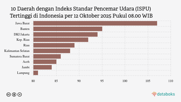 Kualitas Udara di Jawa Barat pagi ini terburuk di Indonesia. Berdasarkan halaman Indeks Standar Pencemar Udara (ISPU) Kementerian Lingkungan Hidup dan Kehutanan (KLHK) pada Minggu (12/10/2025) pukul 08.00 WIB terungkap bahwa indeks kualitas udara di Jawa Barat sebesar 107.