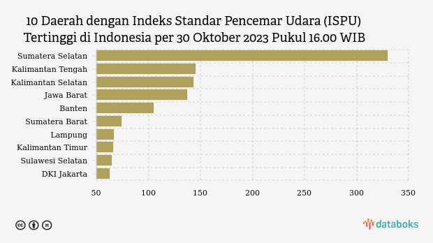 Kualitas Udara di Sumatera Selatan sore ini terburuk di Indonesia. Berdasarkan halaman Indeks Standar Pencemar Udara (ISPU) Kementerian Lingkungan Hidup dan Kehutanan (KLHK) pada Senin (30/10/2023) pukul 16.00 WIB terungkap bahwa indeks kualitas udara di Sumatera Selatan sebesar 330.