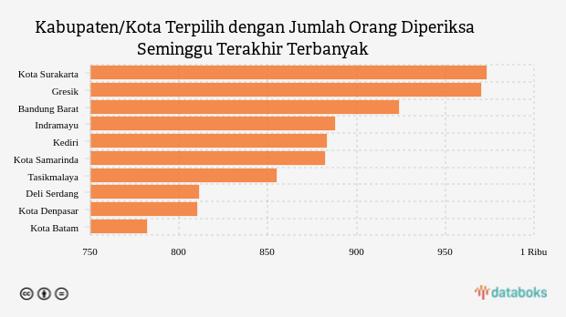 Kemudian, pemeriksaan sebanyak 924 orang per minggu di Bandung Barat, pemeriksaan sebanyak 888 orang per minggu di Indramayu serta untuk test Covid-19 seminggu terakhir di Kediri tercatat 883 orang per minggu.