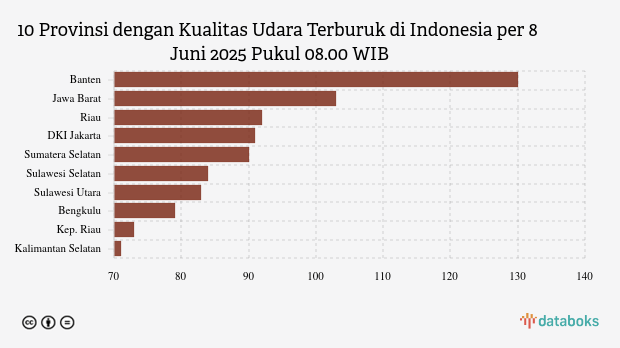 Berikut daftar 10 provinsi dengan indeks kualitas udara terburuk di Indonesia pada Minggu, 8 Juni 2025 pukul 08.00 WIB.