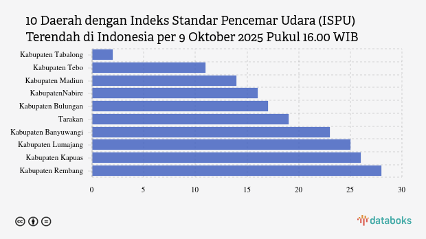 Kualitas udara Kabupaten Tabalong sore ini paling bersih di Indonesia. Berdasarkan indeks kualitas udara versi Kementerian Lingkungan Hidup dan Kehutanan (KLHK), Kabupaten Tabalong memiliki skor 2 pada Kamis (9/10/2025) pukul 16.00 WIB.