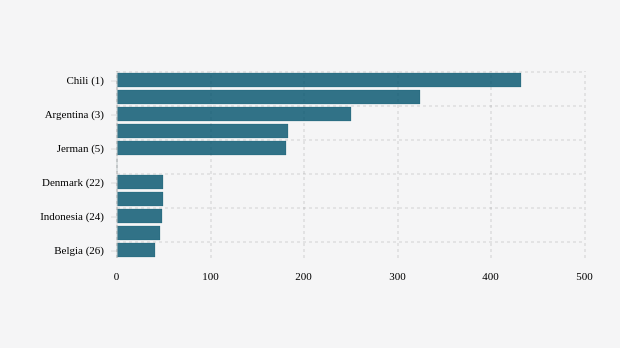 Selanjutnya, Argentina dengan penambahan kasus Omicron 981 kasus (naik 250,36%), penambahan kasus Omicron di Polandia naik 182,82 persen menjadi 4.378 kasus dibandingkan pekan sebelumnya dan Jerman dengan penambahan kasus Omicron 30.041 kasus (naik 180,29%)