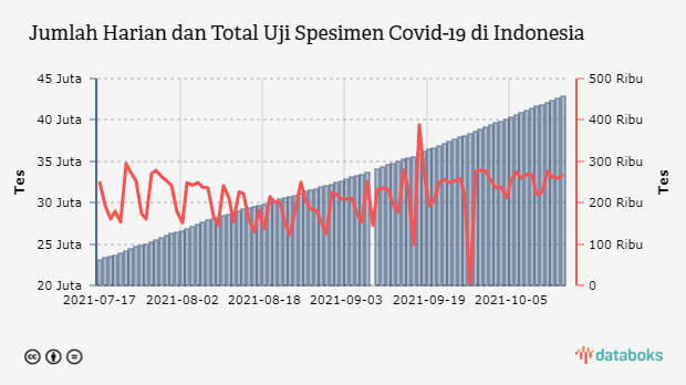 Tes Covid-19 di Indonesia pada Jumat, 15 Oktober 2021 sebanyak 267,34 ribu spesimen. Jumlah ini lebih tinggi dibandingkan spesimen yang diuji pada hari sebelumya. Hingga hari ini, total spesimen yang telah diperiksa sebanyak 42,89 juta.