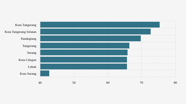 Kondisi yang sama terjadi di kota Tangerang Selatan yang mencatatkan cakupan vaksinasi lengkap sesuai KTP sebesar 72,64 persen. Di kota ini, cakupan vaksinasi lengkap sesuai KTP juga terlihat lebih tinggi dibandingkan pekan sebelumnya yang baru 72,56 persen. Di urutan berikutnya Pandeglang. Kota di provinsi Banten ini mencatatkan cakupan vaksinasi lengkap sesuai KTP sebesar 69,69 persen