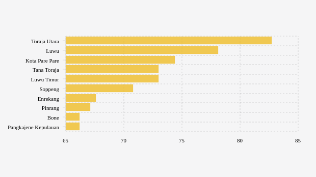Toraja utara adalah kabupaten di urutan pertama dengan cakupan vaksinasi lengkap sesuai KTP tertinggi sebesar 82,67 persen. Kondisi cakupan vaksinasi lengkap sesuai KTP di kabupaten ini terlihat lebih baik dibandingkan pekan sebelumnya yang tercatat 82,62 persen.
