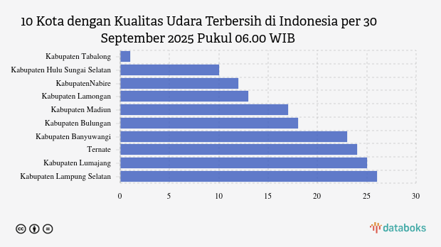 Berikut ini daftar 10 kota dengan kualitas udara paling bersih di Indonesia menurut KLHK pada Selasa, 30 September 2025 pukul 06.00 WIB.