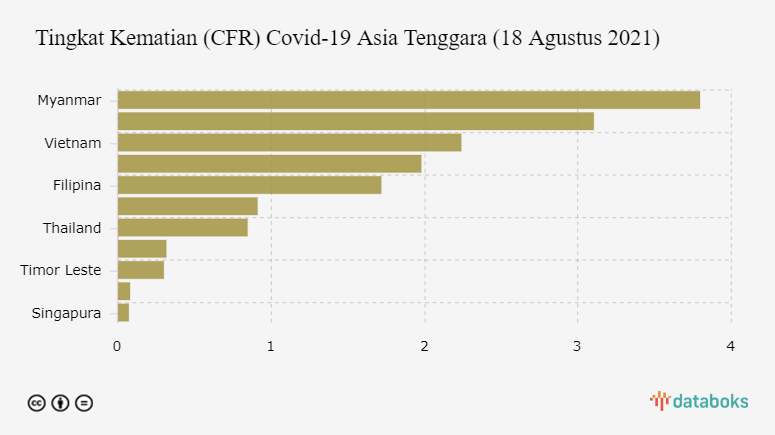 Indonesia berada di urutan kedua dengan tingkat fatalitas kematian sebesar 3,1%. Hingga 18 Agustus 2021, Covid-19 di Indonesia telah merenggut nyawa 121, 1 ribu orang. Vietnam menempati urutan ketiga dengan tingkat kematian 2,24% dan total kematian 6,77 ribu orang.