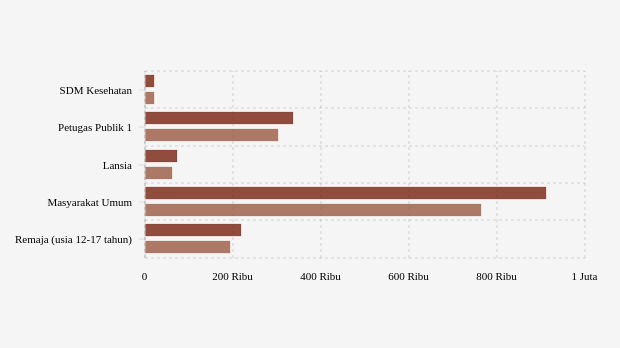 Vaksinasi ke petugas publik dengan target 128,89 ribu jiwa. Vaksinasi dosis 1 dilaporkan telah mencapai 337 ribu jiwa (261,46 persen target) dan dosis 2 dengan capaian 235,06 persen atau berhasil tersalurkan sebanyak 302,98 ribu jiwa.