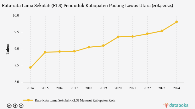 Rata-rata lama sekolah (RLS) penduduk berusia 25 tahun ke atas di Padang Lawas Utara, Sumatera Utara sebesar 9,82 tahun pada 2024.