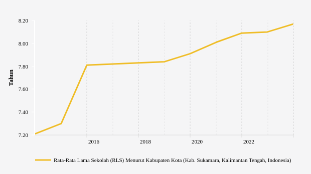 Rata-rata lama sekolah (KLS) penduduk berusia 25 tahun ke atas di Sukamara, Kalimantan Tengah sebesar 8,17 tahun pada 2023.