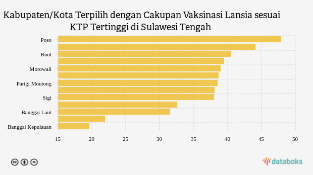 Poso adalah kabupaten di urutan pertama dengan cakupan vaksinasi lansia sesuai identitas KTP tertinggi sebesar 47,93 persen. Kondisi cakupan vaksinasi lansia sesuai identitas KTP di kabupaten ini terlihat lebih baik dibandingkan pekan sebelumnya yang tercatat 47,9 persen.