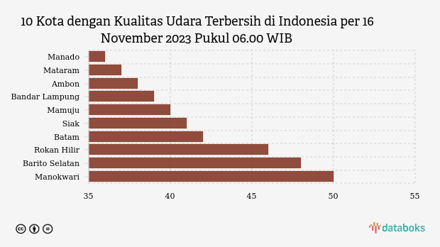 Manado menjadi kota dengan kualitas udara paling bersih di Indonesia pada Kamis (16/11) pukul 06.00 WIB.