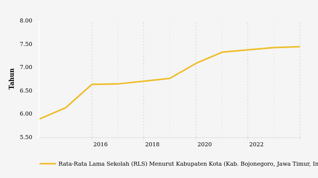 RLS penduduk Bojonegoro meningkat 0,02 tahun (0,27%) dibanding tahun sebelumnya yang selama 7,43 tahun. Sementara, dalam lima tahun terakhir RLS tersebut meningkat 0,68 tahun (10,04%).