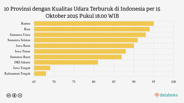 Berikut daftar 10 provinsi dengan indeks kualitas udara terburuk di Indonesia pada Rabu, 15 Oktober 2025 pukul 18.00 WIB.