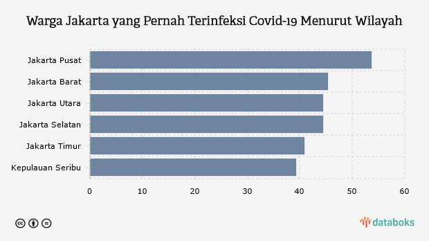 Kemudian, 44,4% warga Jakarta Selatan telah terinfeksi corona. Sebanyak 40,9% warga Jakarta Timur juga telah terinfeksi virus tersebut. Sedangkan, jumlahnya mencapai 39,3% di Kepulauan Seribu.