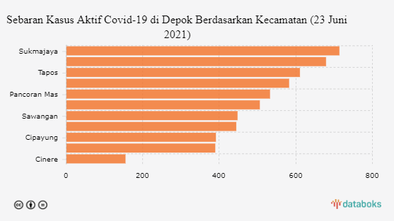 Kasus aktif corona di Depok mencapai 5.449 orang pada 23 Juni 2021. Jumlah kasus Covid-19 tersebut merupakan yang terbesar dibandingkan kabupaten/kota lainnya di Jawa Barat.