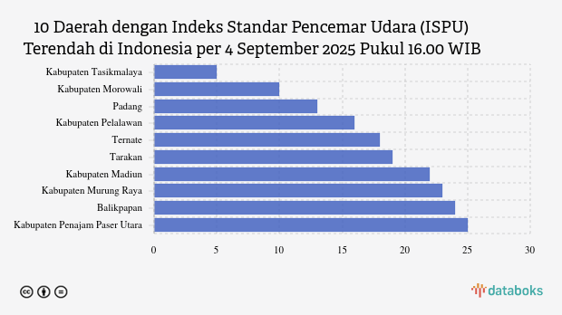 Kualitas udara Kabupaten Tasikmalaya sore ini paling bersih di Indonesia. Berdasarkan indeks kualitas udara versi Kementerian Lingkungan Hidup dan Kehutanan (KLHK), Kabupaten Tasikmalaya memiliki skor 5 pada Kamis (4/9/2025) pukul 16.00 WIB.