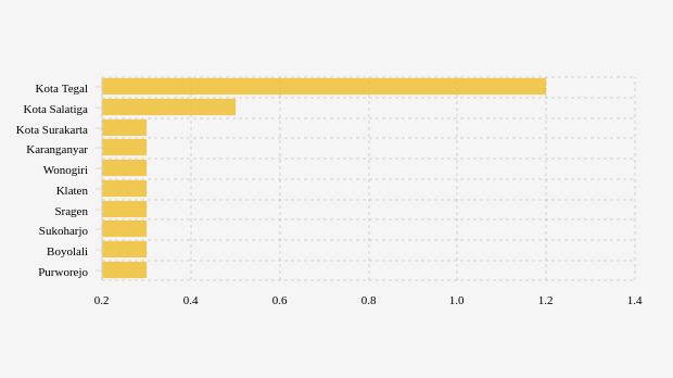 Sebaliknya untuk kota Salatiga, data Kementerian Kesehatan memperlihatkan jumlah konfirmasi aglomerasi positif covid-19 mingguan sebesar 0,49 jiwa per 100 ribu penduduk/minggu. Angka ini lebih tinggi dibandingkan pekan sebelumnya yang tidak dilaporkan adanya jumlah konfirmasi aglomerasi positif covid-19 mingguan. Di urutan berikutnya kota Surakarta. Kota di provinsi Jawa Tengah ini mencatatkan jumlah konfirmasi aglomerasi positif covid-19 mingguan sebesar 0,35 jiwa per 100 ribu penduduk/minggu