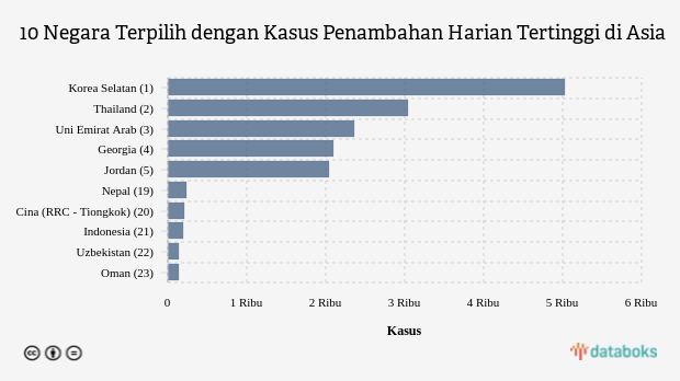 dengan angka kasus penambahan harian sebanyak 2,097 orang, Yordania mencatatkan 2,045 kasus penambahan harian dan Iran.