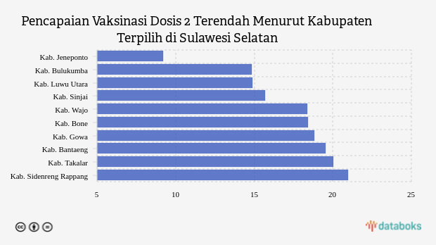 Menyusul berikutnya adalah kabupaten Bulukumba. Untuk vaksinasi dosis 2, daerah ini masuk nomor dua terendah. Dengan sasaran vaksin sebanyak 346,76 ribu peserta, namun baru direalisasikan 14,86 persen atau 51.532 peserta.
