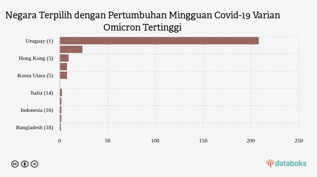 Virus Covid-19 varian Omicron (B.1.1.529) di dunia semakin menyebar dan telah mencapai 5,58 juta kasus pada Kamis, 05 Januari 2023. Uruguay mencatatkan penambahan kasus Omicron tertinggi di dengan pertumbuhan mingguan mencapai 207,69 persen. Di negara ini, GISAID mencatat jumlah penambahan kasus Omicron sebanyak 120 jiwa. Secara harian kasus di wilayah ini naik 207,69 persen dibandingkan hari sebelumnya.