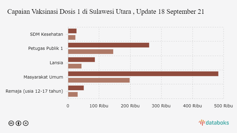 Cakupan vaksinasi dosis 1 di provinsi Sulawesi Utara, Sabtu, 18 September 2021, telah mencapai 43,58 persen. Angka ini setara dengan 906,68 ribu peserta vaksin dari target yang ditetapkan sebanyak 2,08 juta orang. Sementara untuk vaksinasi dosis 2 hingga kemarin telah tercapai 21,19 persen dari target.
