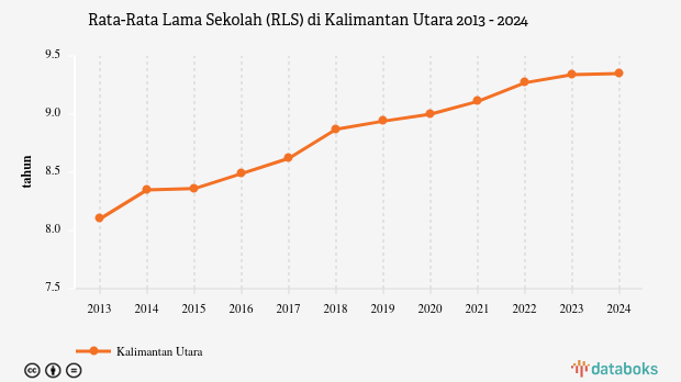 Badan Pusat Statistik (BPS) mencatat Rata-Rata Lama Sekolah (RLS) di Kalimantan Utara pada tahun 2024 adalah 9,35 tahun. Angka ini menunjukkan peningkatan sedikit dibandingkan tahun 2023 yang sebesar 9,34 tahun. Jika dibandingkan dengan rata-rata RLS dalam tiga tahun terakhir (2022-2024) yaitu 9,25 tahun, terlihat adanya peningkatan. Namun, pertumbuhan RLS Kalimantan Utara dalam lima tahun terakhir (2020-2024) menunjukkan perlambatan.