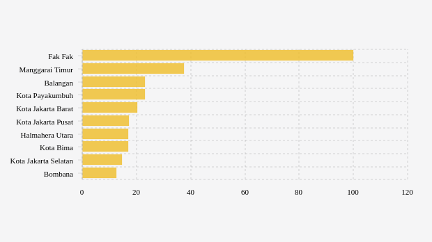 BOR khusus Covid-19 lima kabupaten/kota teratas dengan angka lebih dari 20,36 persen, yaitu Fak Fak, Manggarai Timur, Balangan, kota Payakumbuh dan kota Jakarta Barat dengan masing-masing nilai 100 persen, 37,5 persen, 23,08 persen, 23,02 persen dan 20,36 persen.