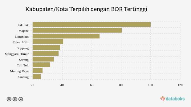 BOR khusus Covid-19 lima kabupaten/kota teratas dengan angka lebih dari 38,57 persen, yaitu Fak Fak, Majene, Gorontalo, Rokan Hilir dan Soppeng dengan masing-masing nilai 100 persen, 80,36 persen, 65,22 persen, 40,66 persen dan 38,57 persen.