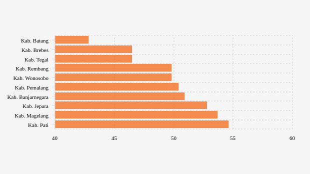 Kabupaten Batang di urutan pertama. Sampai dengan kemarin, untuk vaksinasi dosis 2 wilayah ini baru mencatatkan 42,8 persen. Angka ini menjadi yang terendah dibandingkan 35 kabupaten/kota lainnya. Sedangkan untuk pencapaian dosis 1, sampai dengan kemarin sudah tercapai 73,4 persen atau diikuti oleh 725,3 ribu peserta vaksin.