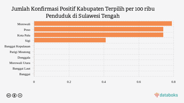 Berikutnya di posisi kedua adalah Poso. Wilayah ini mencatatkan angka konfirmasi mingguan 0,74 kasus per 100 ribu penduduk. Dibandingkan pekan lalu, jumlah terkonfirmasi Covid-19 pekan ini masih lebih tinggi yang artinya belum terlihat ada perbaikan.