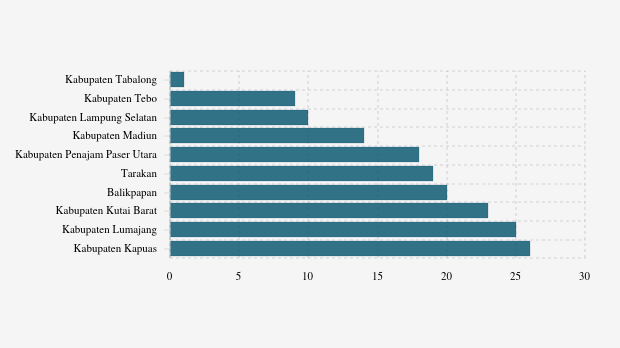 - Kabupaten Kutai Barat (Kalimantan Timur): 23